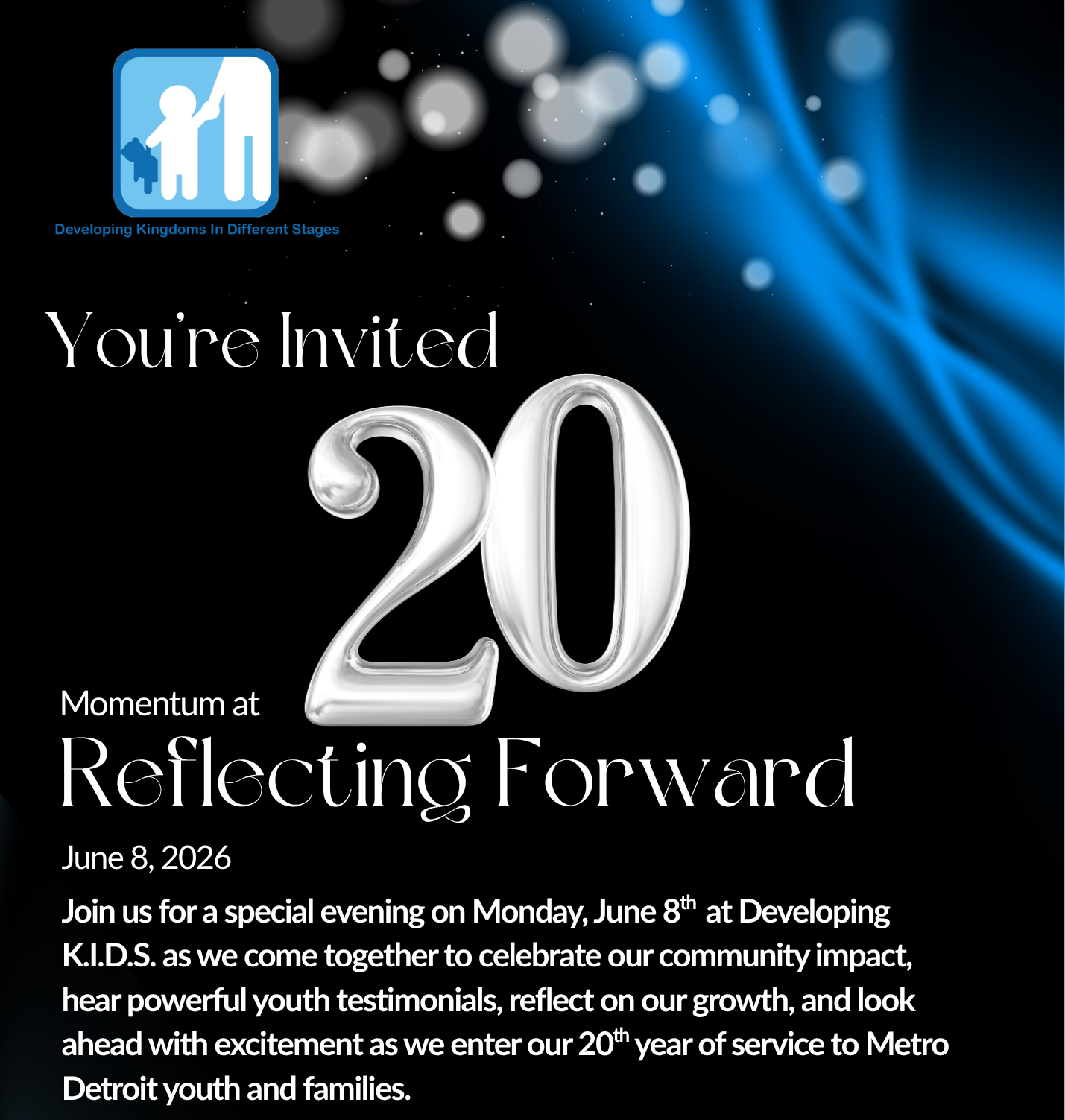 Partner with us as we celebrate Developing K.I.D.S.’ 20th Anniversary with our community and families we serve. Showcase your commitment to empowering youth through education, mentorship, and opportunity. As a sponsor, your brand will gain high-visibility exposure to community leaders, professionals, and philanthropists, all while directly supporting programs that drive real change.